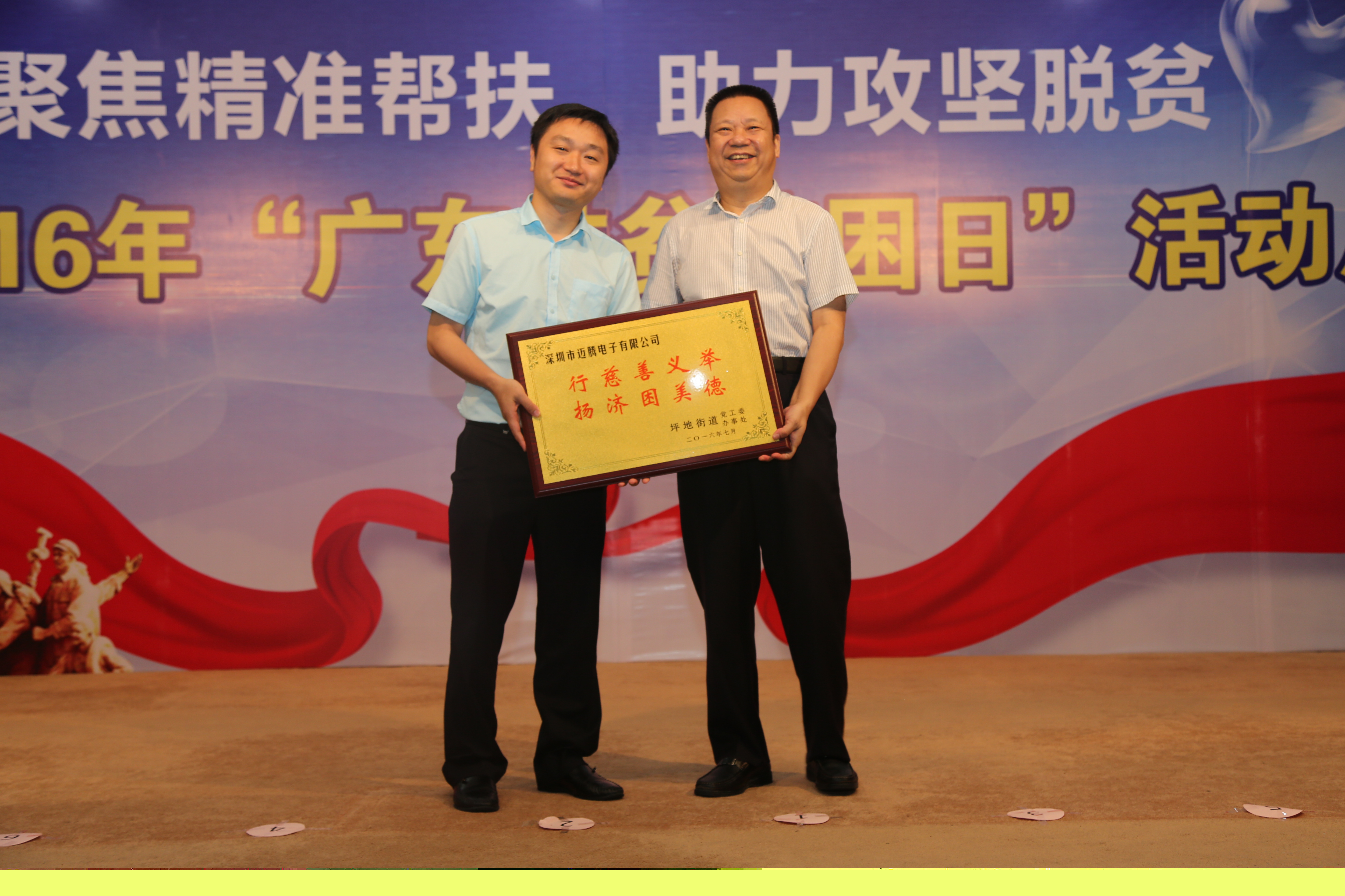 邁騰電子積極參與坪地街道扶貧開發(fā)“雙到”幫扶工作籌集資金活動。此次活動公司總經(jīng)理黃能君先生代表邁騰捐贈善款80000元人名幣,坪地街道黨工委書記鐘春平代表坪地街道現(xiàn)場接受捐贈支票,并為我司頒發(fā)榮譽牌匾。邁騰用實際行動展現(xiàn)了坪地企業(yè)良好的社會責(zé)任感和傾情奉獻的大愛情懷。